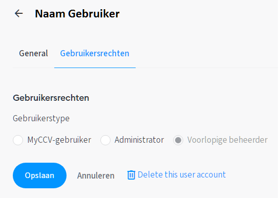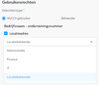 Onderaan de pagina kan je bij Gebruikersrechten een gebruikerstype selecteren. Een MyCCV-gebruikersprofiel heeft een beperkte toegang tot het MyCCV-account doordat het aan een locatie en gebruikersgroep moet toegekend worden. Medewerkers met een MyCCV-gebruikersprofiel hebben hierdoor enkel inzicht tot de informatie en menustructuur die door de beheerder van het account wordt toegestaan. Als beheerder kan je nu ook gebruikersprofielen de rechten geven om de Salespoint-app op een betaalterminal te activeren.